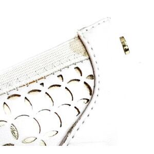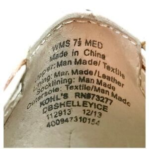 LEATHER LINER, LAZER CUT FAUX LEATHER WITH GOLD BACKING. BOW DETAIL WITH GOLD HARDWARE. THE ORIGINAL ADHESIVE HAS YELLOWED IN A COUPLE OF SPOTS SEEN IN PHOTOS. IT IS NOT NOTICEABLE TO MUCH. PLEASE SEE PHOTOS. 1.5" GOLD METALLIC BLOCK HEEL. CUSHIONED FOR ALL DAY WEAR.