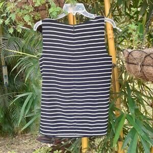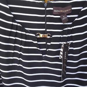 Dana Buchman Women's Black & White Horizontal Striped Top, Sleeveless with Soft Ruching and Gold Horsebit Embellishment at the Neckline. The bodice is lined, the bottom half of the blouse is not lined. Silky 100% polyester fabric is very soft, but wears with crisp, finished style. Tag Size: Medium. Chest: 38". Brand New With Tags. Never Worn. * size tag is coming loose a bit * Non-Smoking Home.