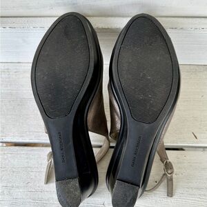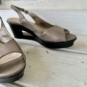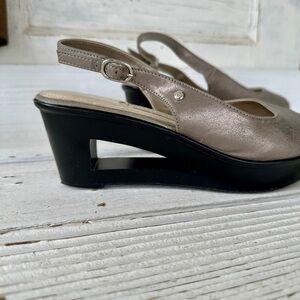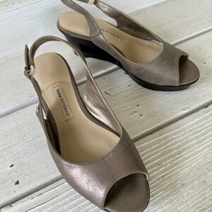 DANA BUCHMAN, WEDGE SANDALS. SILVER METALLIC, SLINGBACK WITH CUTOUT WEDGE.SIZE9M