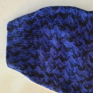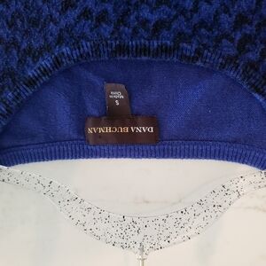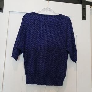 Dana Buchman crew neck sweater in royal blue/purple and black print. Short sleeve sweater. Round neck, pull over sweater. Beautiful and like new. Size Small. Color is beautiful. drop shoulder sweater,