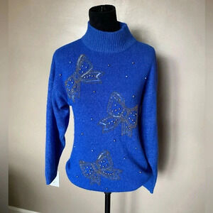 DANA SCOTT royal blue vintage mock neck sweater 80s beaded BOWS silk angora sz M