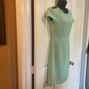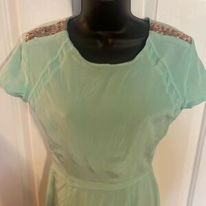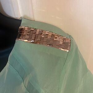 Simple but edgy! Short sleeve mint colored dress with rose gold shoulder sequins. 100% Silk. Above the knee length. Hidden back zipper. Lined.