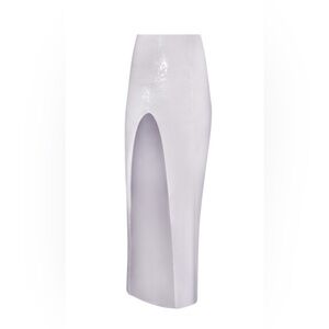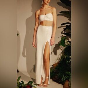 skirt- Skirt: 93% Polyester, 7% Elastane. Lining: 80% Polyamide, 20% Elastane. Made in the USA. The Ava Skirt is snow-white, sequined, and sultry with a slit cut up to there. Double down on the shimmer and style with the coordinating Sahra Top.