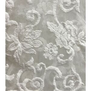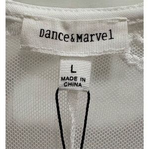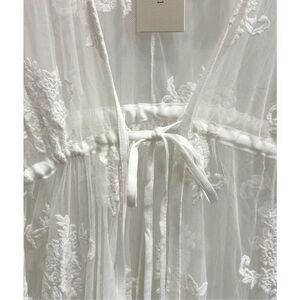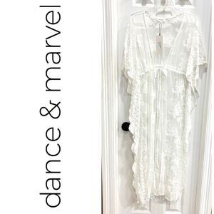 DANCE & MARVEL makes this amazing white embroidered-lace beach cover-up/festival duster in ladies size large. It's a semi-sheer duster made of lightweight mesh fabric that shapes the tulle silhouette, and features floral embroidery throughout, with a scalloped edge on the sides. It has a deep V-neck and short, wide sleeves (they come to my elbow). The totally adjustable self tie at the bodice can be worn open or secured, and make it an appropriate fit for so many body shapes. It's open on each side from the armpit down. This is a great layering piece! I can see it over casual clothes at a festival (get your Stevie Nicks on). It would also make a great beach cover-up because it's flowey and light as air - perfect for summer days. The pit-to-pit measurement is 18" and the length is 53". I'm 5'2" and it hits me at the ankles, so it's a perfect length. It's totally BoHo vibes, adorable and NWT!