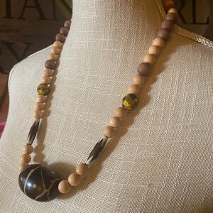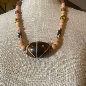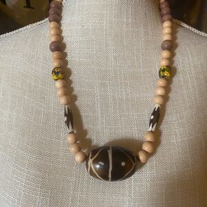 Dango - is a full length necklace made of medium size wooden beads and small African accent beads all centered around a large brown and beige African bead