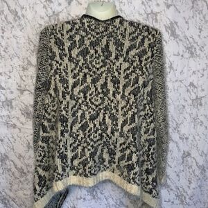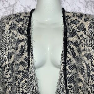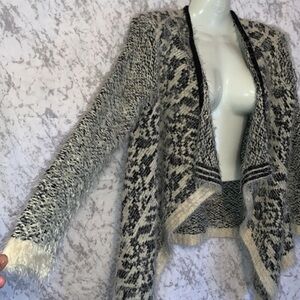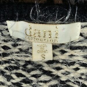 Black and white, drape front cardigan sweater ladies size small, by Dani. This pretty cardigan has the look and feel of angora. Super soft, stylish and snuggly! In excellent like new condition with no obvious rips or stains!
