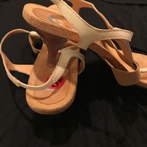 Leather and stretch strap sandal cork in between sole with rubber bottom suede bottom to avoid feet from sliding nwot