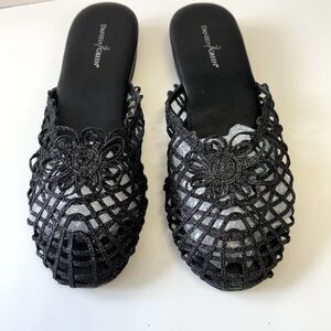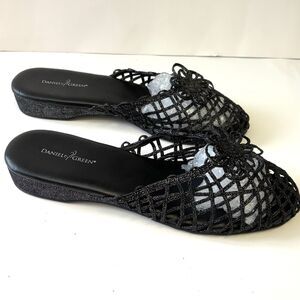 DANIEL GREEN Diana Lattice Slippers Black Shimmer Mules Low Wedge