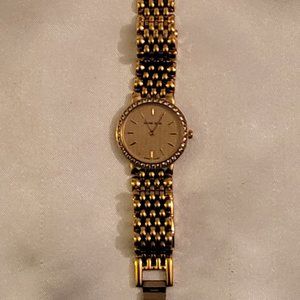 A vintage watch full of elegance featuring diamonds around the facing of this watch.