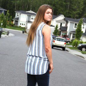 Adorable striped blue, black and white tunic. Made of a very comfortable, flowy, light material. Very classy!