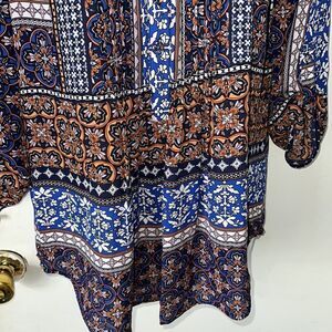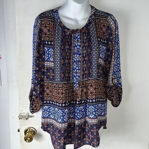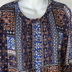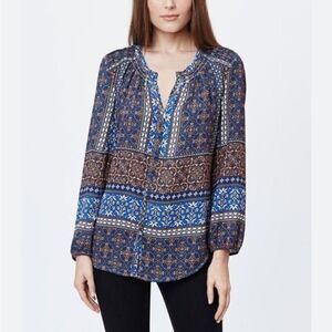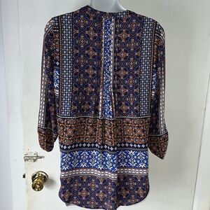 NWT! Inspired by old world mosaic tile in a washable polyester for a lightweight feel, crew neck with button up option, pleated chest detail and roll sleeves, curved hemline. Size XS, measures 18” from armpit to armpit and 27” from top of shoulder to bottom hem