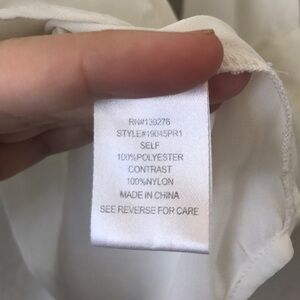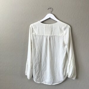 Delicate lace adorns the yoke and sleeves of this chiffon blouse styled with a split neck with and tie closure with tassel trim. - Split neck with self tie closure - Long sleeves with banded cuffs - Lace trim - Approx. 28" length - Imported