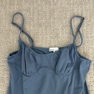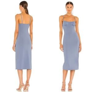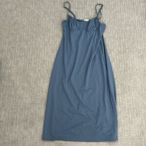 Elegant blue midi dress. Features spaghetti straps. Perfect for any occasion.