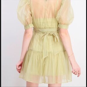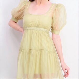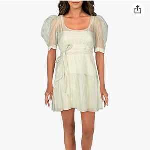Chic mini dress with puff sleeves. Light green hue. Perfect for summer outings.