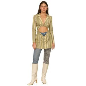 A jazzed up version of a mini blazer. Midriff baring cutout. A-line skirt. Button front. Notch lapels. Long sleeves. Lined. Muted yellow, sage, and pink celadon stripes throughout. Padded shoulders. Versatile. Contemporary. Coastal. B