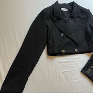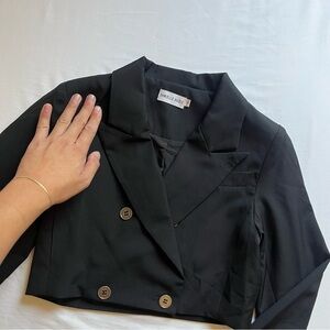 DANIELLE GUIZIO black pointed collar double breasted cropped blazer jacket