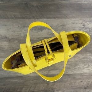 Absolutely stunning bag- bright sunny golden yellow. Magnetic flap enclosure with a braided flap. Adjustable and detachable crossbody strap. The entire bag is structured and stiff. Gorgeous curvy outline. Silver tone hardware. Unique signature logo print lining. Multiple pockets, with a center dividing pocket. Tall foot prong studs that don’t allow the leather to touch the ground. Made in Honduras.