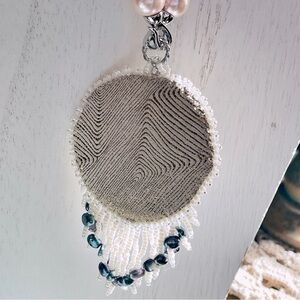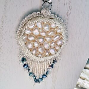 DanLena Beaded Pearl Cluster Silver Necklace Earring Set Leather Handmade NWT