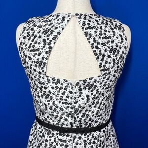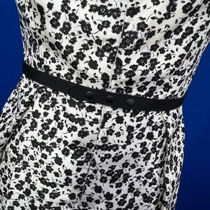 Excellent, perfect, condition. White with small black floral design. Black bow belt. Fit and flare. Size 12. Approximate measurements in inches when laid flat: chest 19 across pit to pit, waist 16.5 across, full length 37.