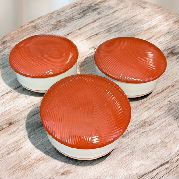 Made of high-quality porcelain, these boxes/bowls feature red and tan stripe accents and stunning brownish-red lids with a unique Jacquard pattern. Made in Japan between 1986 - 1989.