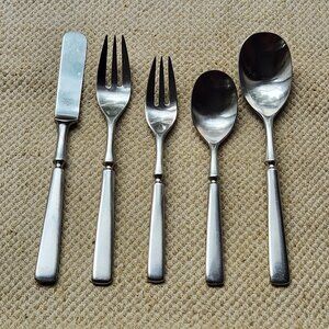 Set includes dinner knife, dinner fork, salad fork, table spoon and teaspoon.