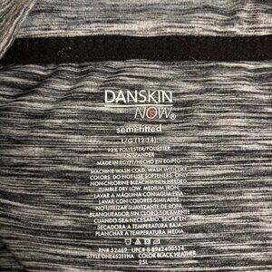 This is a women's casual activewear top by Danskin in a semi-fitted style. It features a 1/4 zip closure, long sleeves, and comes in a gray heather color. The size is Large and the top is designed for regular fit. Ideal for active occasions, this pullover top offers both comfort and style for women on the go.