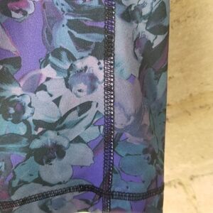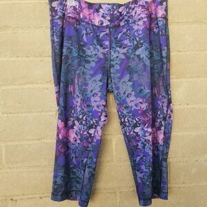 Good condition. Drawstring. Polyester, spandex. Lying flat waist is approximately 17". Inseam is approximately 19". Purples, pinks