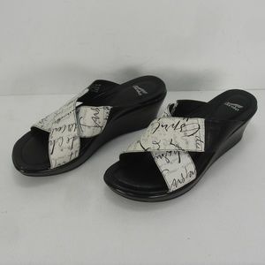 Description: Leather platforms wedges slides open toe sandals shoes, front criss cross bands, elastic gore on top sides bands, front top band is white with black , silver and bronze writing, black upper back bands, leather lining.