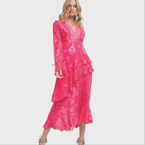 DARK PINK Frill Lacr plunge front midi dress In Hot Pink. Size 8 NWT