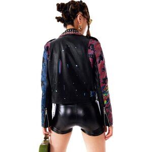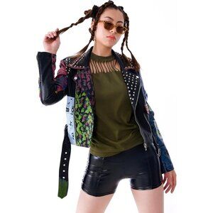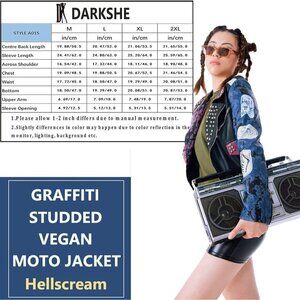Eco-friendly Material: ✅100% eco-friendly ultra-soft vegan leather (shell); 100% polyester (lining). The motorcycle jacket with exposed zipper features a cropped pattern. This outwear also featuring a chic turn-down collar style, 3D print, two side pockets and quilted shoulder design.