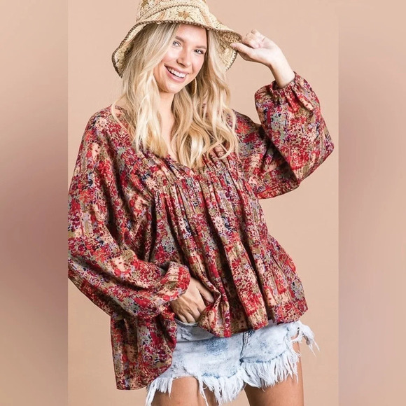 DARLING Women’s Size S Burgundy Multi Flowy V-neck Cotton Boho Long Sleeve Tiered Blouse.