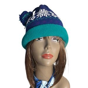 Made in USA with a fun winter pattern. Navy blue with white snowflakes, teal fleece along the inner edge that can be worn folded up or down. Fun pom pom dangles from the top. Great for general wear, skiing, snowboarding, winter play. Preowned with no apparent flaws.