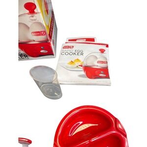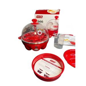 The DASH Rapid Egg Cooker is a compact electric appliance designed to cook up to 6 eggs at a time. With a power output of 360 watts, this egg cooker can quickly prepare hard-boiled, poached, scrambled, or omelet-style eggs. It features auto shut-off and rapid boil functions for convenience and ease of use. The appliance has a red plastic exterior, a model name of Dash Rapid 6, and is manufactured in China. Ideal for those looking to simplify their egg-cooking process, this egg cooker is a practical addition to any kitchen.