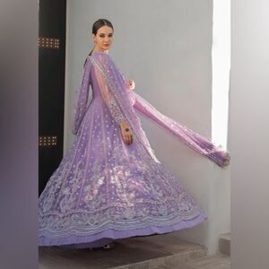 Description: Net Embroidered Hand Emballished Front yoke 1 pcs Net Embroidered Back yoke 1 pcs Net Embroidered Hand Emballished Front Panels 6pcs Net Embroidered Back panels 6 pcs Net Embroidered Hand Emballished Sleeve 26” Net Embroidered Duppata 2.75 yards Net Embroidered Duppata pallu 2.5 yards Russian Grip Inner 5 yards.