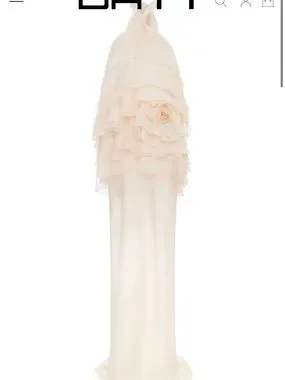 Datt elegant cream backless halter dress with layered ruffle bodice and a soft floral accent. Sheer flowing skirt creates a graceful, modern silhouette. Comfortable halter neckline for an effortless, refined look.