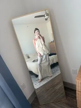 Worn once for my bridal shower. Un altered. I used hem tape towards the top of the skirt to shorten the length but have taken it off & dry cleaned since.
