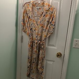 Stylish dress with multicolor floral design. Features button-up front and elegant pattern.