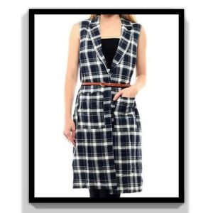 Davi & Dani Blue and White checkered plaid long line boyfriend vest with caramel brown belt. Collared with douuble pockets, split seam hem. Slight padding in shoulders for structure.