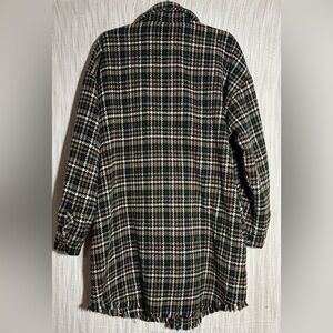 Stylish plaid jacket. Features button closure. Frayed hem for a trendy look.