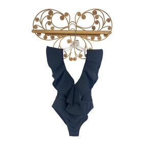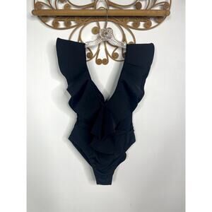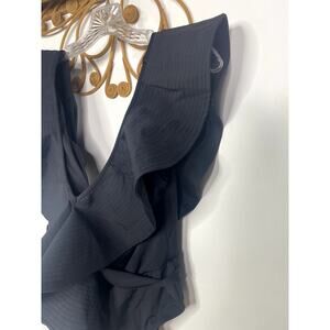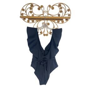 DAVI & DANI Women's Solid Ruffle Sleeve Tie Front One Piece Swimsuit Black