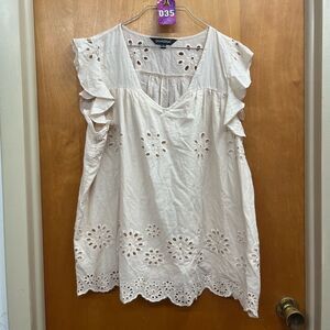 Chic cream blouse with eyelet design. Features ruffled sleeves. Perfect for casual elegance.