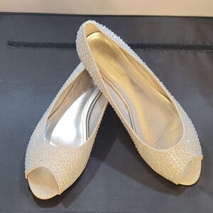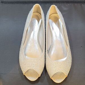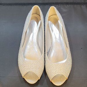 DAVID BRIDAL LOW WEDGE PEEP-TOES WITH CRYSTALS WOMEN'S SHOE SIZE 11 COLOR SILVER & CRYSTAL Add a little sparkle and shine to your ensemble with these low, peep-toe wedges, adorned with iridescent crystals. Synthetic all man-made materials lining upper balance textile upper man-made sole heel height measurements approximately 1" inches wedge THIS ITEMS IS PRE-OWNED EXCELLENT CONDITION WITH ONLY LIGHT SIGNS OF WEAR IF ANY CHECK THE PICTURES