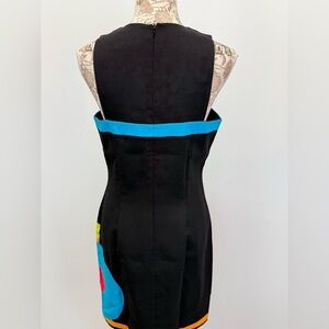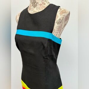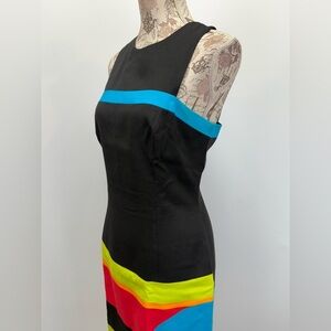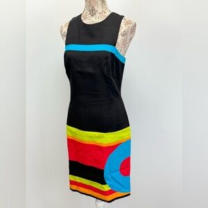 Black, red and blue sleeveless geometric print dress from DAVID MEISTER, size . Dress is fully lined and has zip back closure.
