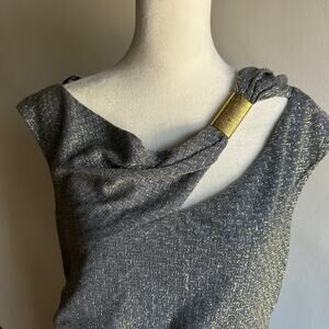 Gorgeous cocktail dress from David Meister. In a soft cadet blue weave with gold, this dress is super flattering on all bodies with a wide, draped neckline with gold accent, and ruching on one side.