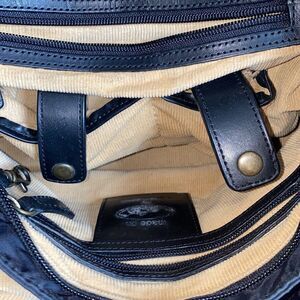 Black nylon hobo style bag with 3 zip compartments, middle compartment has zip pocket and 2 slip pockets both with strap closures. Goldenrod corduroy lining. Excellent condition. 3 thick leather rectangular feet in the bottom. Measures 15” x 9” x 5” with an 11” strap drop.