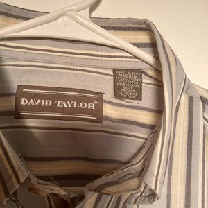 This David Taylor short sleeved dress shirt is in excellent condition. It has 7 buttons going down the front, 2 buttons to hold the collar down, and 2 spare buttons inside the bottom flap. There is 1 pocket on the left hand side of the chest. The shoulder seam to the bottom hem measures 29 3/4" in the front, and 31 1/2" in the back from the collar seam down to the hem. Across the chest it measures 23", and the waist area measures 23" from one side seam to the other. The shoulder seam to the end of the sleeve measures 10", and the underarm seam to the end of the sleeve measures 7 1/2". The arm opening itself measures 8". The shirt was made in China, and is made of 65% polyester and 35% cotton.