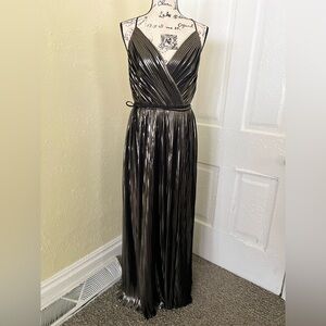 Shiny metallic fabric on this pleated A-line makes your next special event look gleam even brighter. The flowy skirt comes complete with a sexy slit for showing some leg and, of course, your best heels.