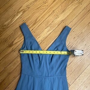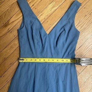 David’s Bridal sleeveless gown, size 2, soft dusty blue chiffon, V-neckline, empire waist, fully lined, hidden back zip, lightweight and flowy full-length skirt, flattering silhouette, perfect for bridesmaid, wedding guest, prom, or formal occasions, elegant and timeless, romantic aesthetic, cottagecore elegance, ethereal core, wedding core, soft glam core