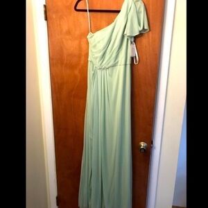 Never been worn with tag. Meadow green stunning and romantic look Asymmetrical neckline and one shoulder bodice features cold shoulder detail,beaded detail at waist. Floor length mesh skirt with side slit is ultra-feminine and chic.Fully lined. Imported polyester. Back zip. Size 8 Offers welcome Ships the next day If you bundle items from my closet you can get up to 20% discount