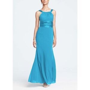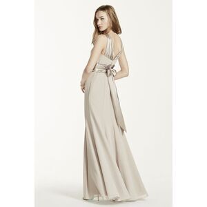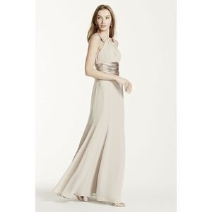 This long chiffon and charmeuse combination dress is a flattering look for all body types. The high neck is a sophisticated look that pairs nicely with the length of the dress.